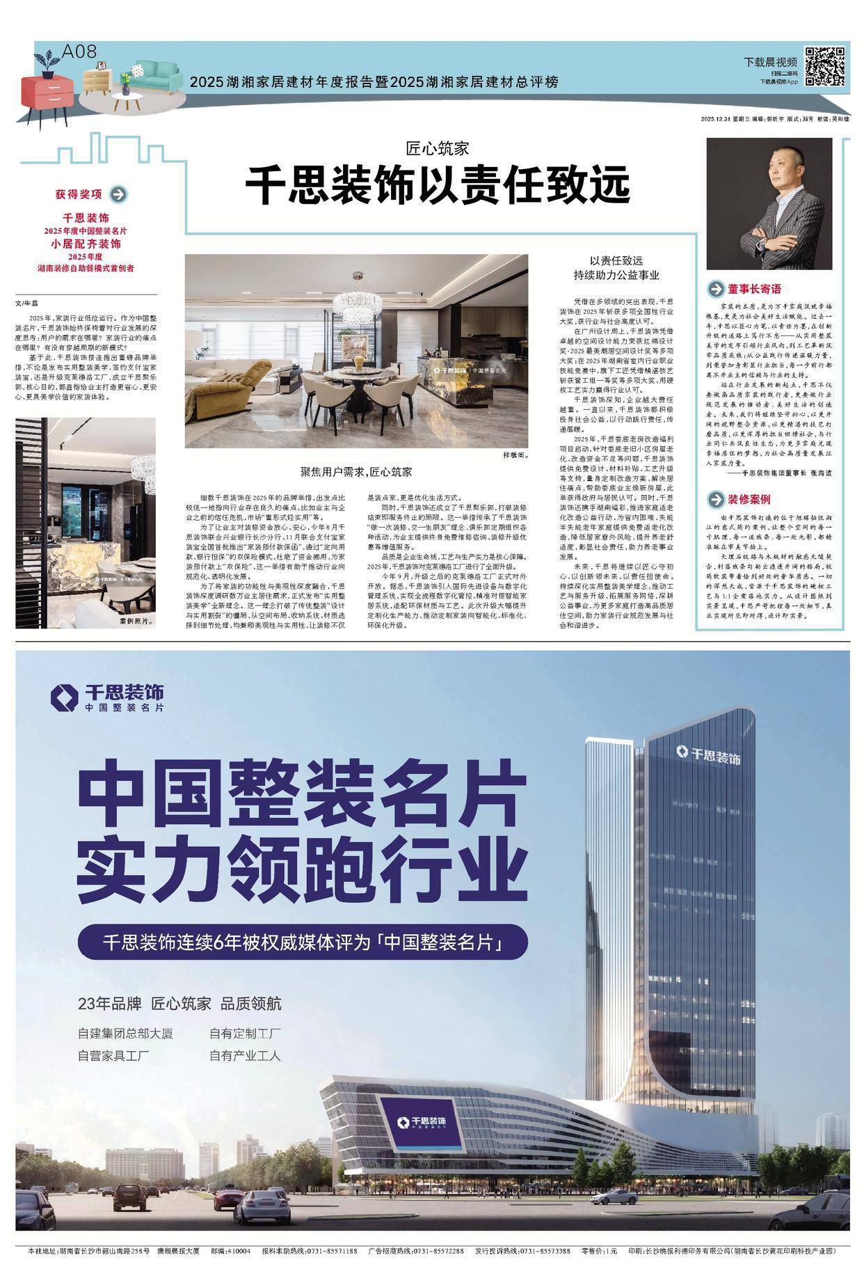 值得提及的是,潇湘晨报《2025湖湘家居建材年度报告暨2025湖湘家居建材总评榜》于12月底推出,千思装饰荣获2025年度中国整装名片; 小居配齐装饰荣获2025年度湖南装修自助餐模式首创者。